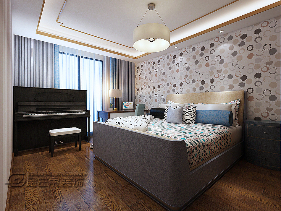 兒童房,一角黑色鋼琴喜人眼球,熱愛音樂,心身健康。星星點(diǎn)點(diǎn)可愛十足,床上大大小小的抱枕,也是玩耍的伙伴。童心滿滿的背景墻,日日夜夜陪伴孩子美好的童年。