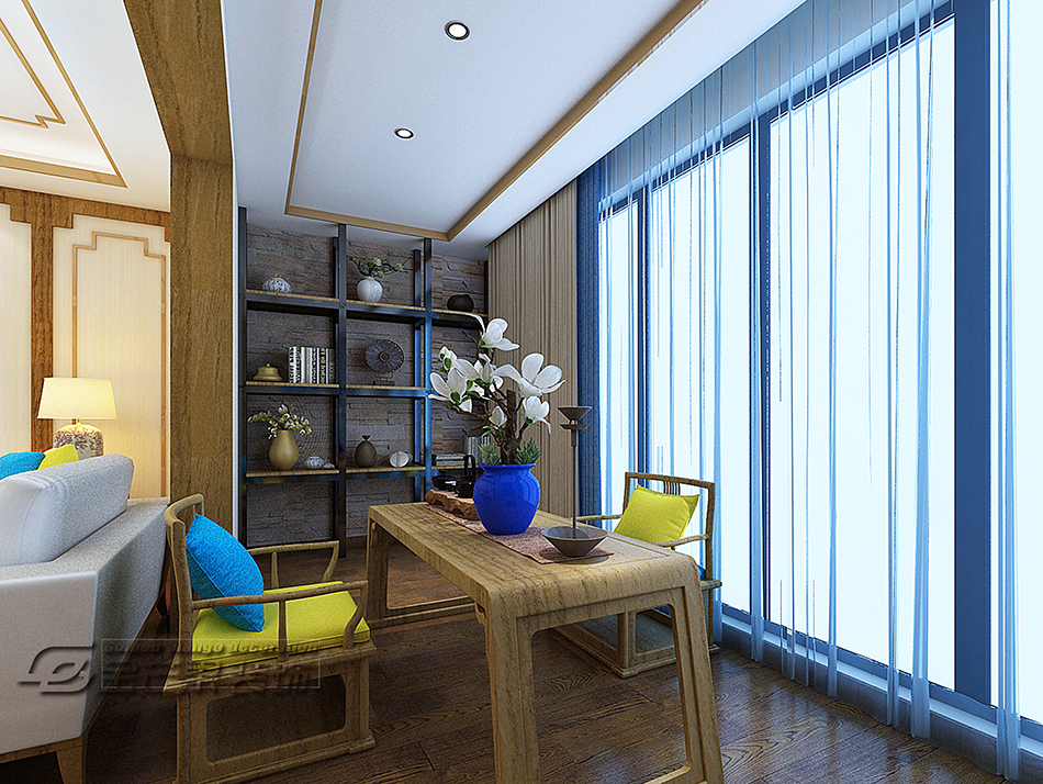 客廳,陽臺設(shè)置品茶區(qū),業(yè)主也是一個重視待客之道的人,電視背景墻絲絲的紋路,搭配旁邊的枯樹,更有風(fēng)吹枯樹的意境。木質(zhì)的茶幾、電視柜、地板品質(zhì)十足。藍(lán)紫色的花瓶活躍著整體的氣氛,燈具的設(shè)計體現(xiàn)著強(qiáng)烈的中式風(fēng)格。在線條元素的使用上也是一大亮點(diǎn)。