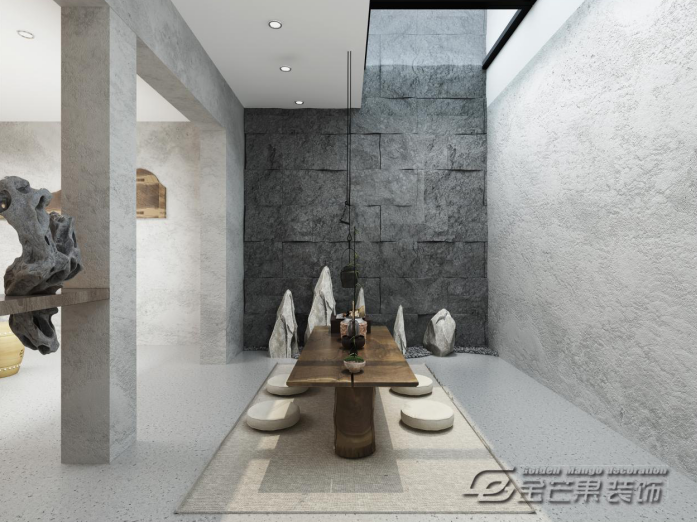 簡單的柱子將會客休閑區隔斷成兩個部分,粗糙的石頭隔斷和樹枝擺臺增加了房間的野性,為整個房間增色不少,但又不顯得突兀。靜坐期間,沏上一壺茗茶,茶香悠然,讓人仿佛置身于天地,身心盡得舒展。