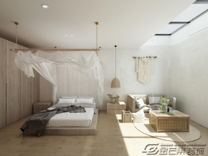 整個臥室以白色系為主,白色增加房間明亮、通透感,采光井的運用巧妙的區分了休閑區和睡覺的區域,增加房間的功能性。白色紗質的床簾溫柔通透,置身其間,仿佛能給予肌膚親切的撫慰。木質的地板、柜子搭配一些編織的家具,使空間充滿的大自然的氣息,營造輕松的氛圍。閉上眼睛,聽著溫柔的風聲,嗅著清新的氣息,做一個溫柔的夢。