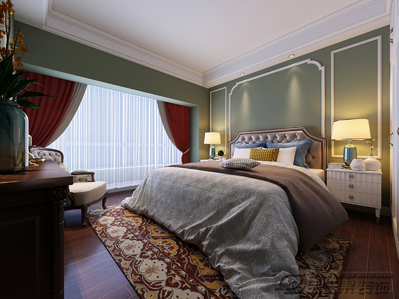 酒紅色的木質地板和布滿碎花的復古地毯,質感更加的豐富。色彩的搭配更顯得靈活,對比更加的強烈,三層窗簾,滿足著屋子對采光的需求,紅色的窗簾和抹茶綠的墻面相互搭配。床頭的兩盞臺燈點亮了溫馨的氣氛。