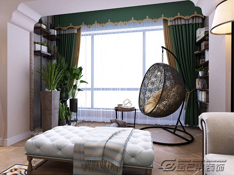 陽臺有很強的的休閑色彩,多種多樣的綠植,躺在優雅的吊椅里面,生活就是這么的愜意。清新恬雅的感覺倍感舒適。窗簾的顏色也和綠植相互呼應。