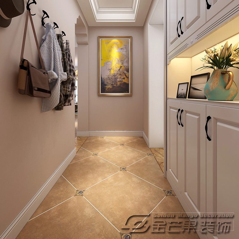 背景墻面以三幅布滿碎花的掛畫作為背景,地磚選擇帶有復古色彩的瓷磚,以白色的線條勾縫,有著豐富的線條感和空間感。搭配上舒適感更好的軟裝搭配,更具特色的門洞增加了整體的立體感,空間上也更加的豐富。色彩的運用也有田園的味道。