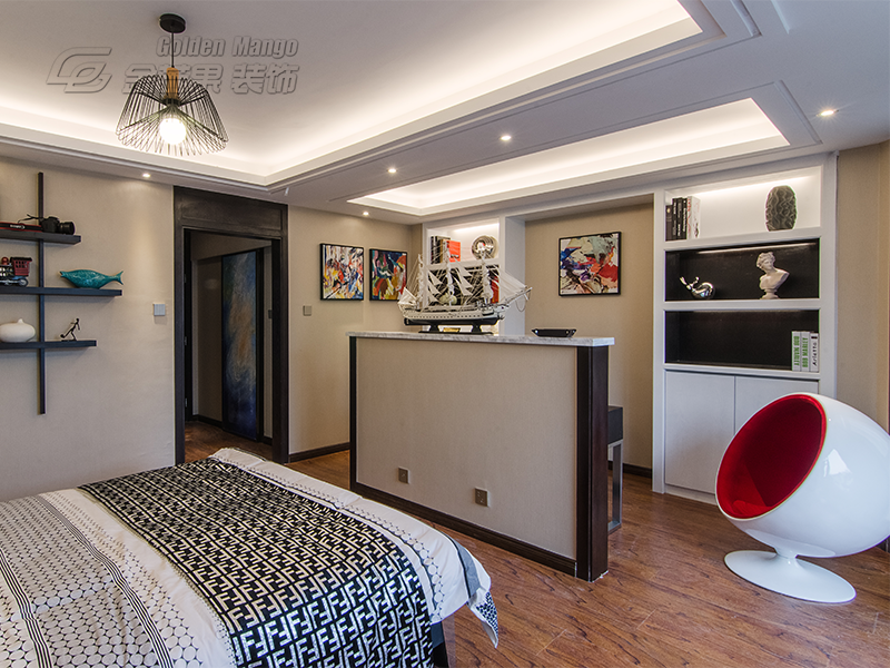 個人空間感強烈。色調舒適,布置了工作和學習的區域,梨木色的木質地板,墻上藝術掛畫,微弱的燈光渲染著休息的氛圍。