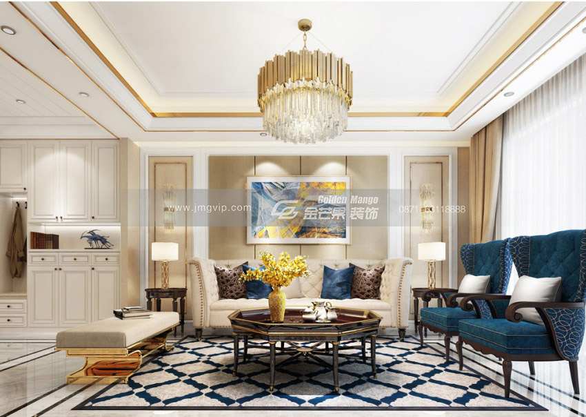 金色被大量使用,座椅、茶幾、吊頂、背景墻、燈光都使用金色元素,亮色金屬線條穿插搭配,提升整體的奢華品質。深藍色的椅子,在色彩上面更顯得活躍,和整體單一的色調形成鮮明對比。