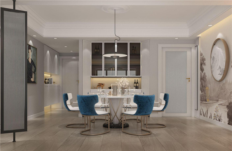 歐式的餐桌椅搭配簡約個(gè)性的吊燈,體現(xiàn)設(shè)計(jì)師的混搭巧思。歐式掛畫和具有東方美韻的大幅裝飾畫背景墻,淡雅又不失藝術(shù)感。間或穿插的金屬和玻璃,挑起靈動(dòng)之美。