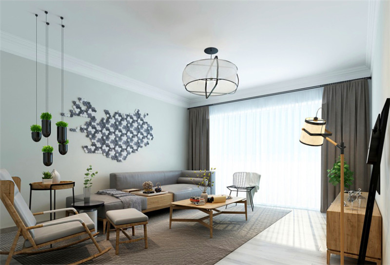 簡單的裝飾搭配清新的綠植,營造自然、休閑的氛圍。灰色的窗簾、沙發椅和地毯,輕松打造高級感,搭配個性的綠植裝飾,讓空間變得文藝且舒適。原木家具的選用讓空間更加接近自然和放松。