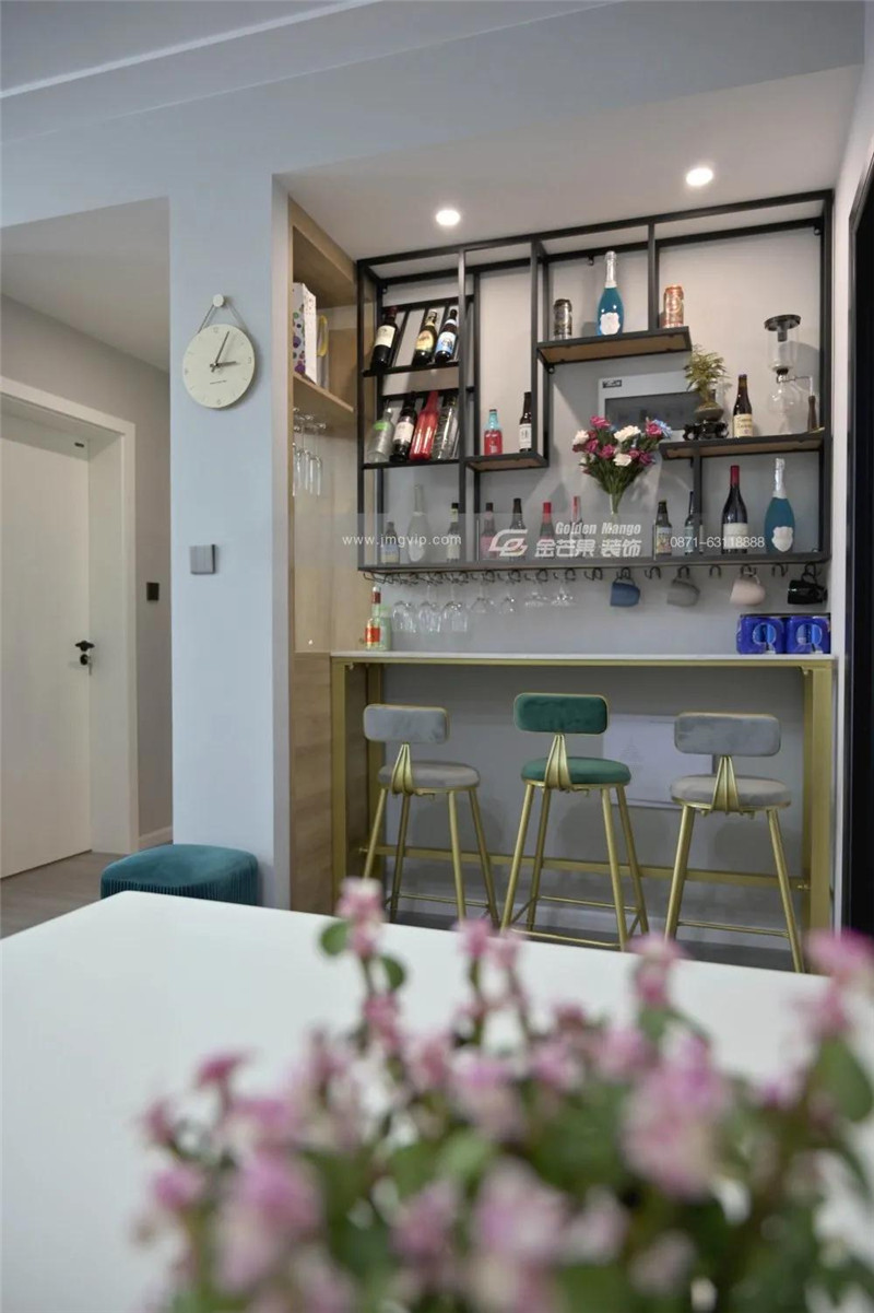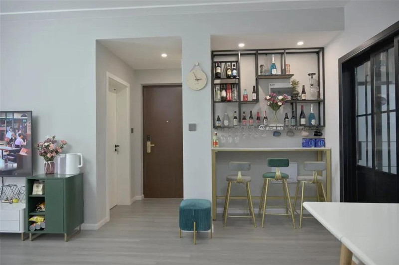黑色酒架和金色鐵藝家具,小空間有大作為。愜意、獨立的休閑區空間,滿足業主的需求。一束花、幾瓶酒,浪漫、閑適的氛圍。自己一人獨酌或和朋友在此小聚,氛圍都會很不錯。