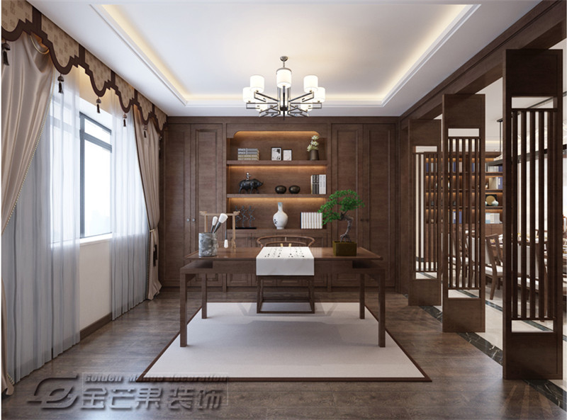原木書(shū)柜和書(shū)桌椅在打造古色古香的氛圍,一些瓷器、筆架、迎客松等都非常具有中式特色。對(duì)稱的書(shū)櫥也呈現(xiàn)出一種對(duì)稱美,包括屏風(fēng)的運(yùn)用也是很有中式之美。