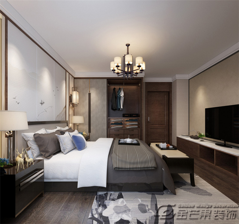 中式的床頭背景墻,豎直方正的線條打造傳統(tǒng)沉穩(wěn)、端莊、大氣的感覺(jué)。中式的吊燈古色古香,提升空間氣質(zhì)。