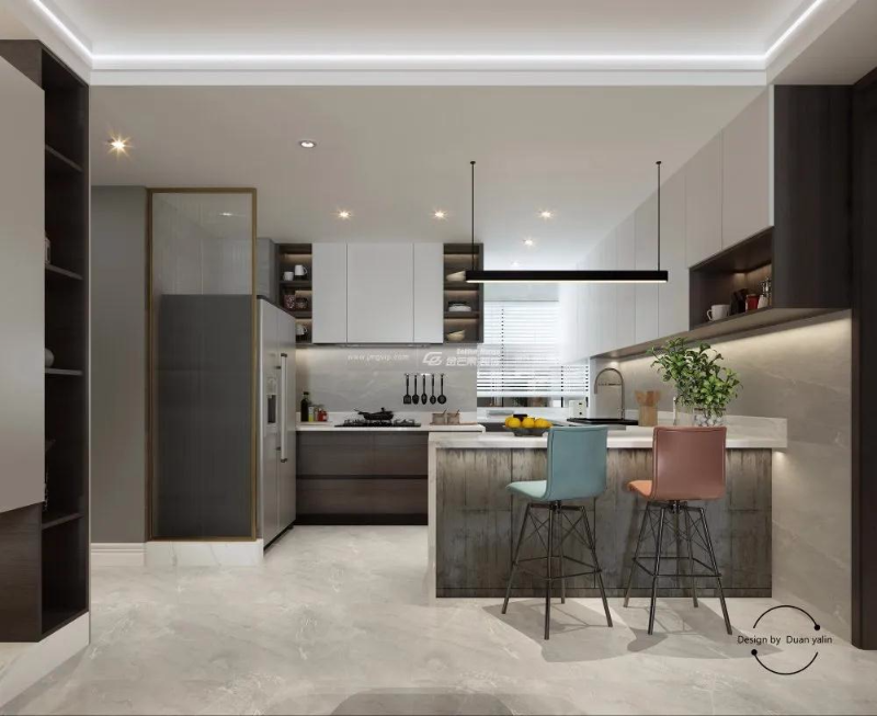 廚房連通原來(lái)的生活陽(yáng)臺(tái)做成了一個(gè)開(kāi)放式廚房,增加廚房空間的同時(shí)也加強(qiáng)了整個(gè)客餐廳的通透性,讓整個(gè)空間變得更加開(kāi)闊。簡(jiǎn)約的白色定制櫥柜同時(shí)兼?zhèn)涔δ苄院兔烙^性,讓廚房用得再久也不會(huì)雜亂。獨(dú)特的島臺(tái)設(shè)計(jì)可以制作西餐、果汁等,莫蘭迪色系的高腳凳做點(diǎn)綴使整個(gè)空間簡(jiǎn)約高級(jí)卻不單調(diào)。