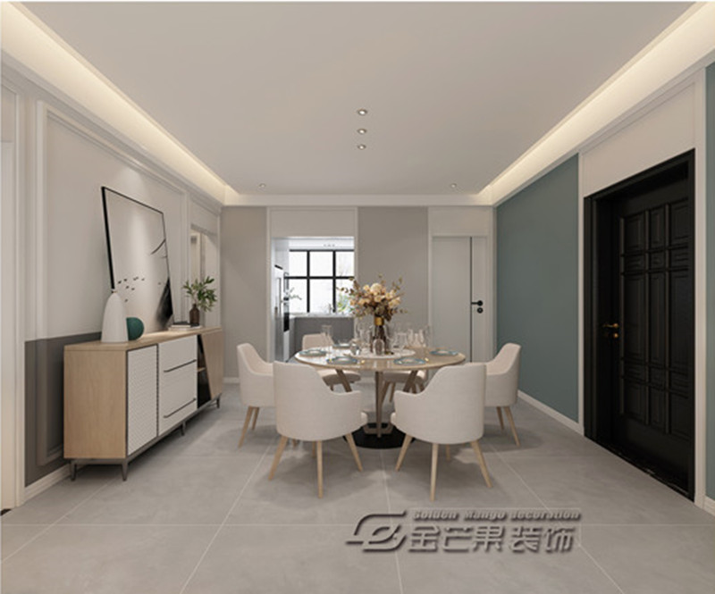 餐廳整體延續客廳的風格,與客廳相協調。白色為底使空間更加開闊,淺灰色地磚和灰色半墻營造層次感,用綠色使整體氛圍更加生動,再以帶原木色的矮柜、餐桌椅點綴,整個餐廳清新自然,充滿文藝氣息。