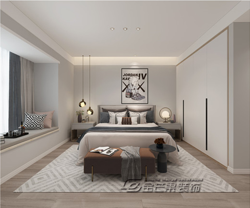 主臥在白色的大基調上,選用淺木色地板、淺灰花紋地毯和棕色床尾凳,增加空間感,提升質感。床頭吊頂內嵌燈槽設計,減少直接照明,更加舒適愜意。鋪有軟墊的飄窗增加趣味性,在雨天倚靠在窗前,小酌一口,聽著窗外淅淅瀝瀝的雨聲,感受微醺愜意的時光。