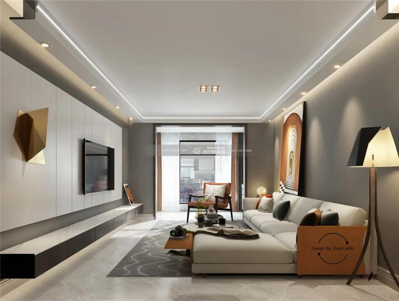 客廳與餐廳相連,不僅釋放了空間,而且讓客餐廳區域更加融為一體,營造延伸流暢的格局序列,凝練現代簡約生活的質感。空間以灰白色調為主,但在軟裝搭配上又以鮮艷出挑的色彩為主,比如當下比較流行的愛馬仕橙,讓這個空間一下子清新明亮又不失品質;電視背景墻的設計立體明亮,使客廳與墻面層次分明,莊重大氣,凸顯高級;立柜的設計和入戶的儲物柜形成了空間的對稱美,且兼顧收納功能,矮柜的設計則與背景墻形成一個空間呼應;吊頂上燈光的流瀉烘托出一種溫馨的氛圍,并突出層次感;整個空間的設計與色彩的搭配清爽明亮毫無違和感。