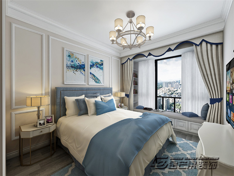 歐式的的窗簾搭配黑色的線條,精致又氣質,延續整體空間清新、優雅的藍白色調,營造優雅、舒適、溫馨的就寢空間。墻上的寫意裝飾畫為整體空間營造藝術感。