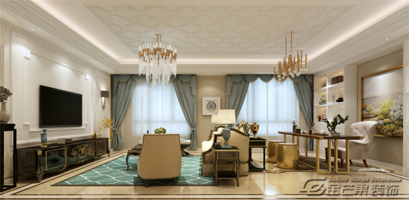 整體空間是以白色為主色調,搭配棕色、米色、金色等輔助顏色,通過色彩的對比給人打造出一種華麗的感覺。充滿歐式特色的窗簾、沙發、桌椅、裝飾畫打造歐式風格。金色家具的應用給人奢華之感但又不顯夸張,恰到好處。客廳和書房的搭配增加房間的功能性。