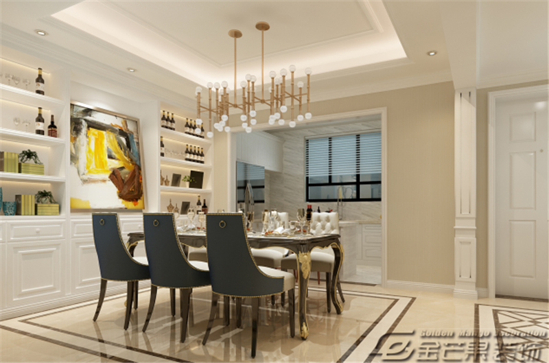 餐廳的桌椅選用上繼續沿用歐式風格,藍色的座椅和整體空間的其他顏色點綴相呼應,紅酒柜上的紅酒、墻上的掛畫,營造歐式氛圍。
