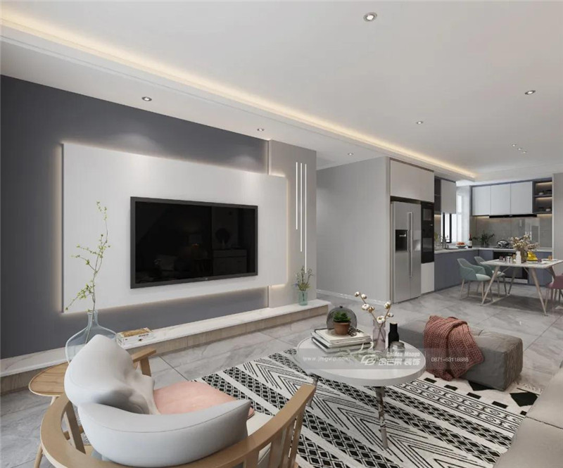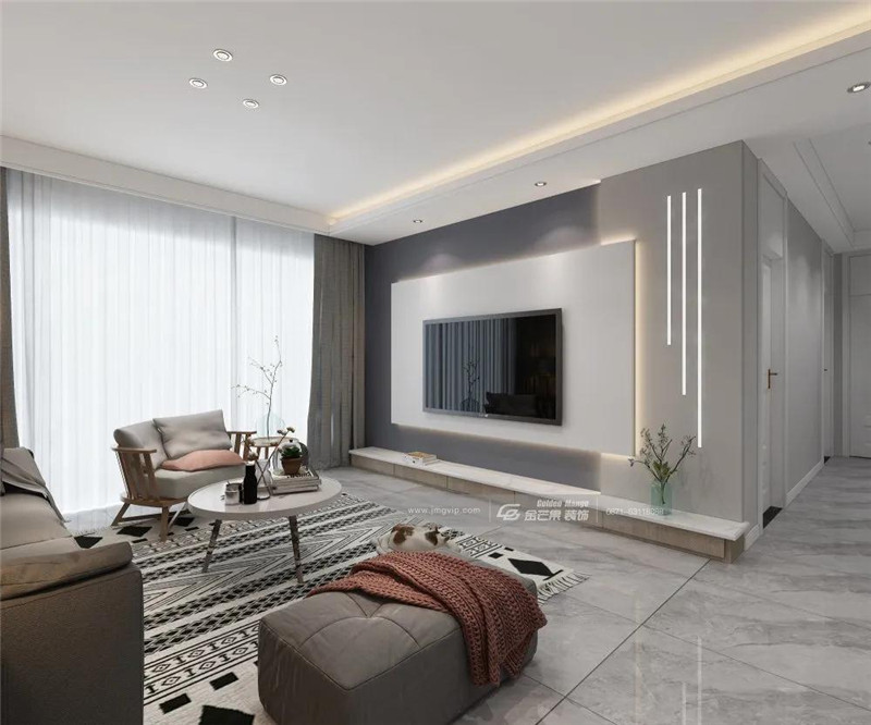 電視背景墻刪繁就簡,卻彰顯簡約的高級,一灰一白,一亮一暗,光與影的交錯,藝術感韻味盡顯。