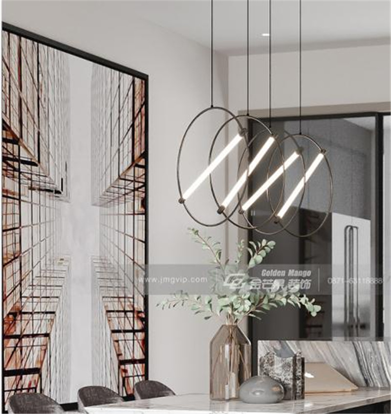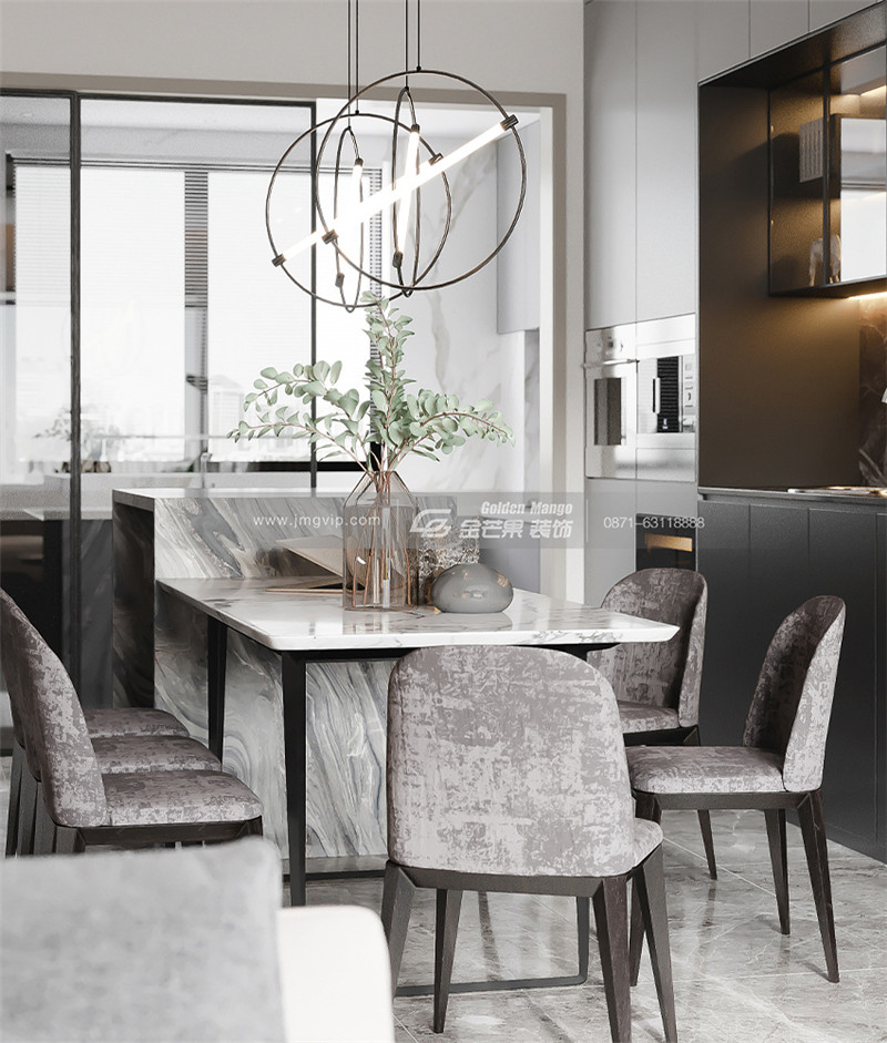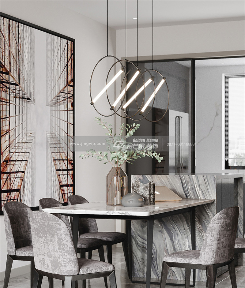 灰色的簡約和純粹的綠色搭配,營造出一種清新、清冽的氛圍。個性的燈飾為整個空間增色不少,讓餐廳變得更加精致了,也更有藝術(shù)感了。
