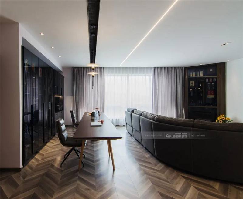 開放式的辦公區(qū)域,又不只是辦公區(qū)域,設(shè)計(jì)師意在將辦公區(qū)域和客廳設(shè)置成一個(gè)靈動(dòng)的、有對(duì)話的空間。除了營(yíng)造一個(gè)舒適、愜意的辦公環(huán)境,業(yè)主也可以在此休閑、喝茶,觀賞窗外的景色。