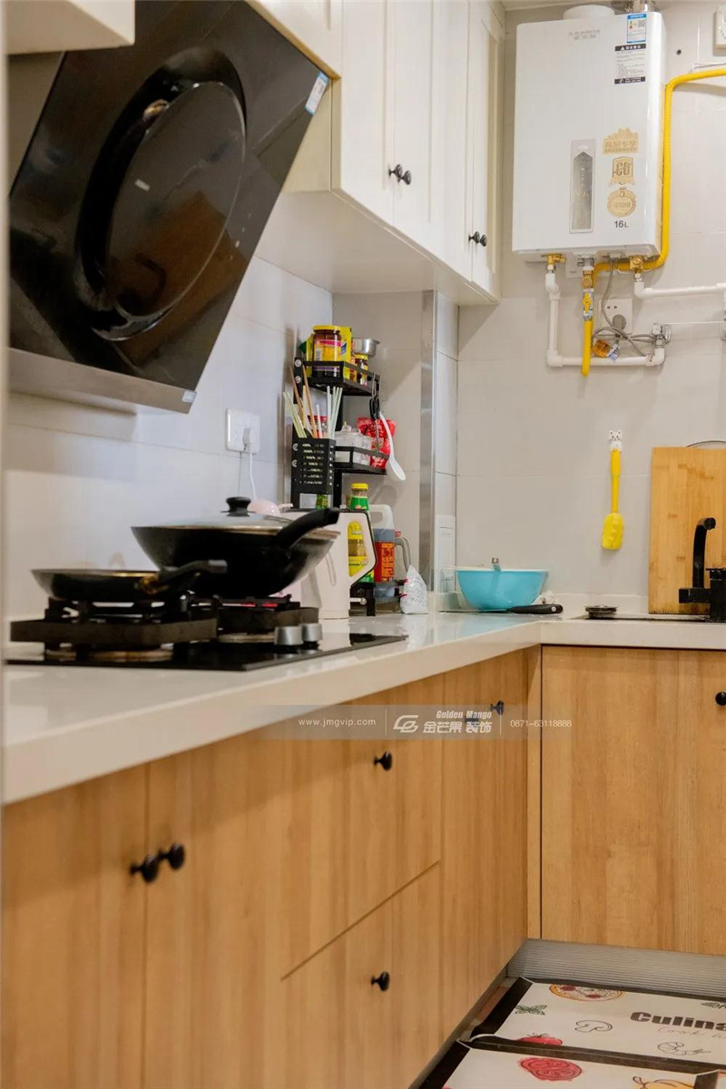 2、廚房打通,增大廚房空間;將原廚房位置的放冰箱處墻體拆除,更多空間留給干濕分離的衛(wèi)生間,有利于衛(wèi)生間功能互不干擾,增加衛(wèi)生間濕區(qū)空間使用。