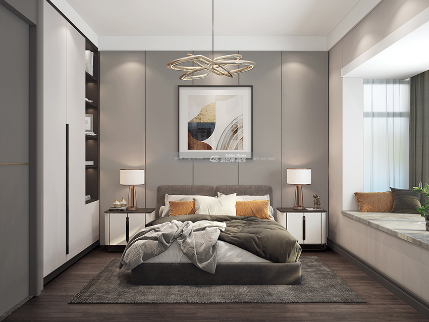 香檳色的色調展現溫柔、高級的格調,精美的燈飾更添精致感。符合臥室柔美、溫馨氣質的空間氛圍,高級感充斥在每個角落。