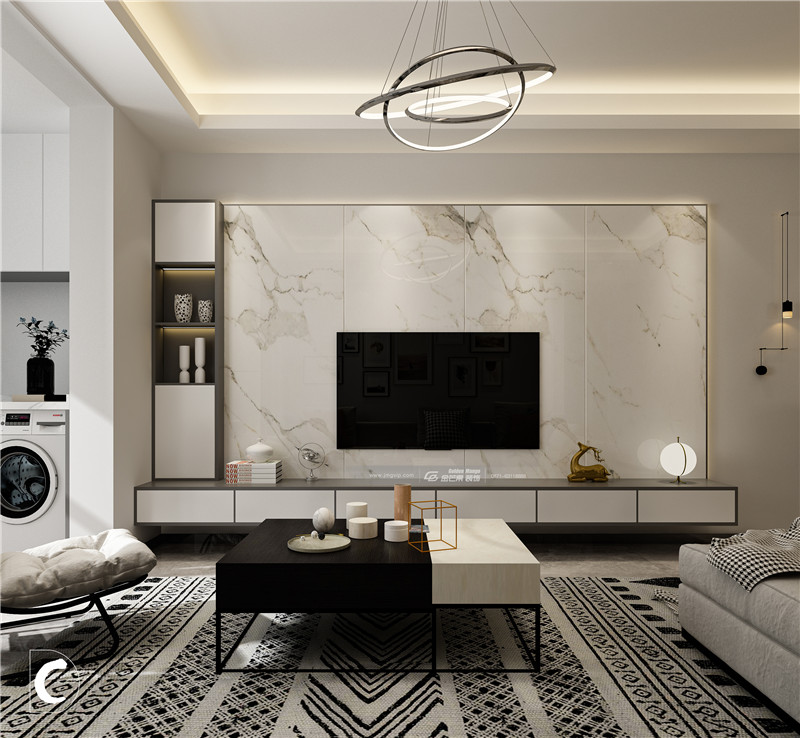 大理石上墻,簡約時尚的紋理讓整個空間大氣不失格調,黑白簡約的茶幾精致、有個性。