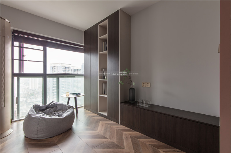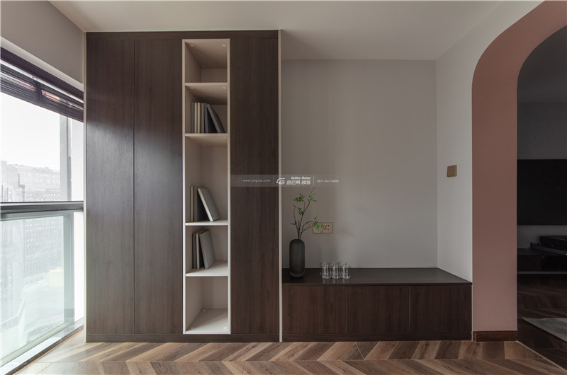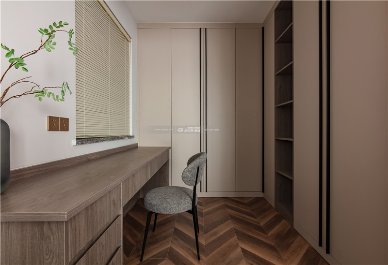 木材的書柜顏色和整體空間呼應,細膩安靜的感覺給屋主一個放松、自在的舒適空間。
