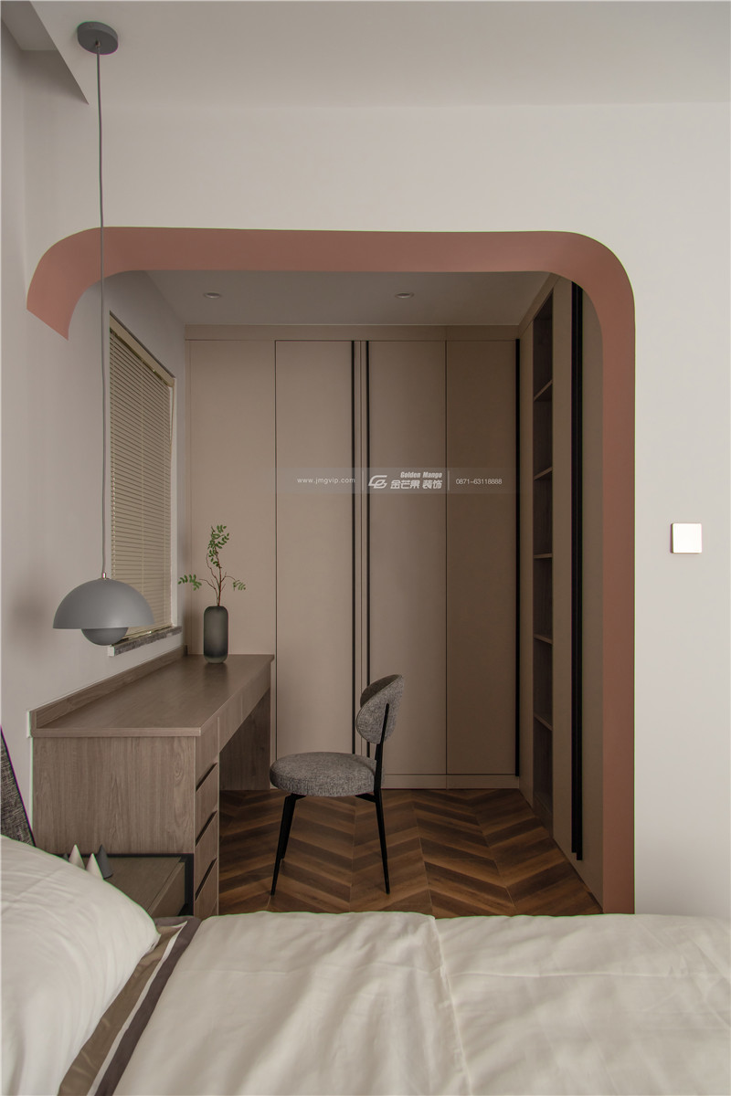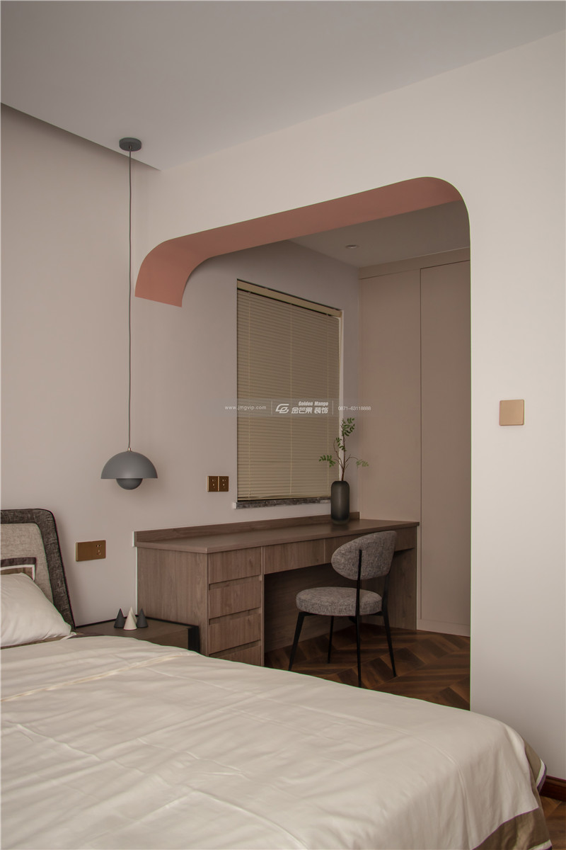 運用拱形的弧度讓空間更顯溫柔,上淺下深的顏色空間感很強,且對比的顏色對比之中展現獨特的家居魅力。地板上的花紋和顏色和整體基調搭配得當,增加活潑、明媚的顏色。溫柔、嫵媚氣質太驚艷了。