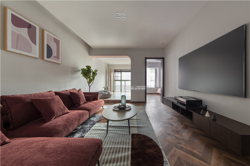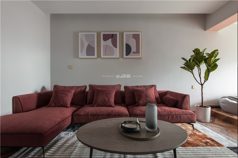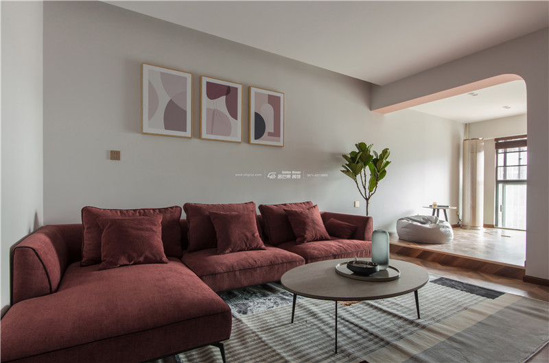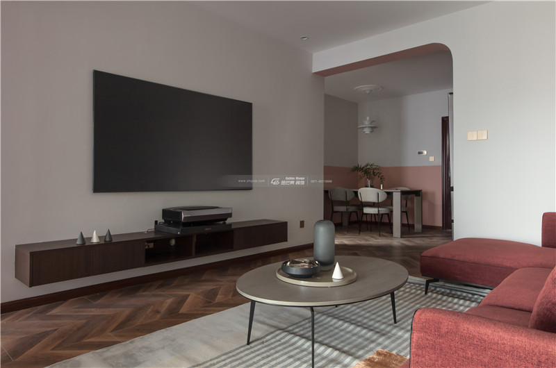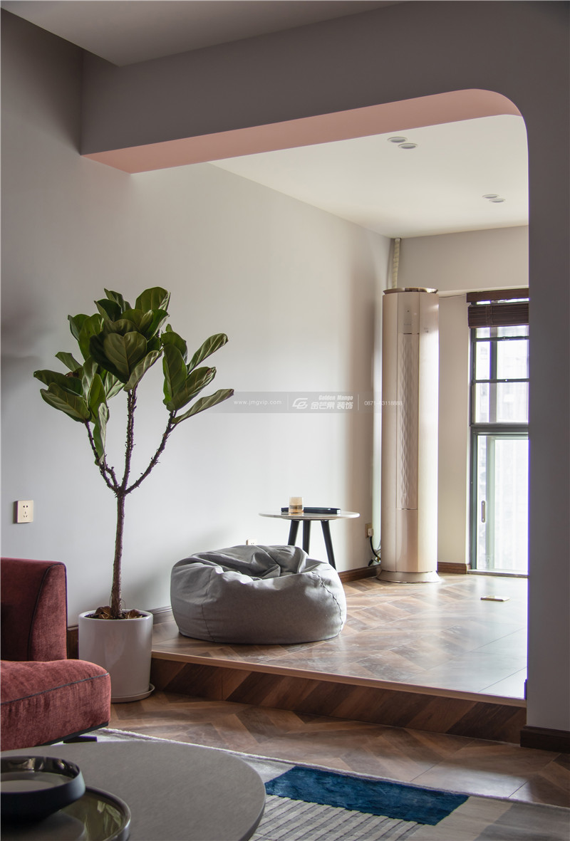 全屋大量運用淺紅色,既有成熟的韻味,也不乏少女的羞澀感。紅色沙發和地板顏色相近,和上面的白墻形成對比,一分為二又和諧共生。線條多運用溫柔的曲線,打造細膩溫柔的感覺。