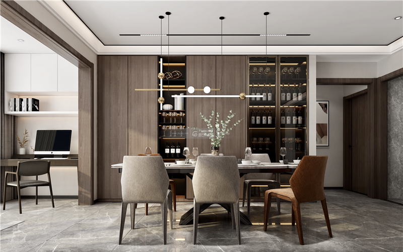 氣質清麗、婉約,讓空間變得細膩而溫柔,精致的燈飾讓空間充滿時尚感。餐桌椅簡約而有品質,高級中又帶有精致、婉約的氣質。餐邊柜也為空間注入了大氣、雅逸的氣質。