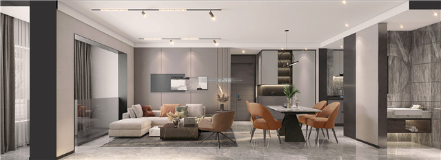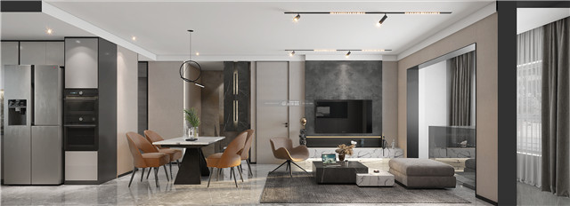 灰色的基調里融入活潑的橙色,渲染出優雅、溫馨的家居格調。采用無主燈設計,暗藏式軌道燈搭配線性燈,光陰之妙呈現的高級感,更好的美化空間。
