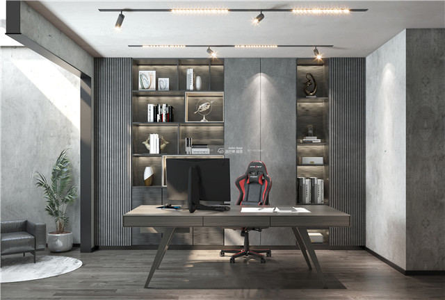 仍然延續整體灰色的質感,打造利于思考的品質個性空間。書柜通過不同材質的搭配體現出豐富的空間層次感。高級有格調。