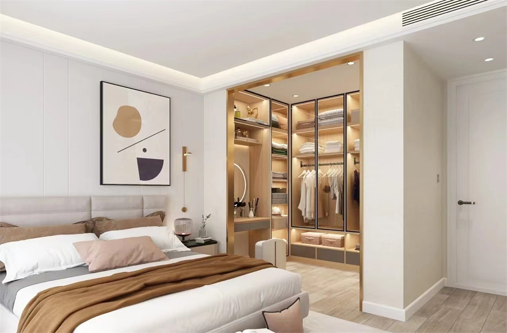 若是遇到一些特殊的戶型,也不必?fù)?dān)心,幸福金芒果裝飾在這溫馨建議您,一定要利用好這段動線,可以在走廊兩側(cè)定制通頂式的衣柜,這樣每次步入房間,都會經(jīng)過自己魅力精致的衣帽間啦,而且左右兩側(cè)空間也變得更豐富,可以容納更多的衣物!