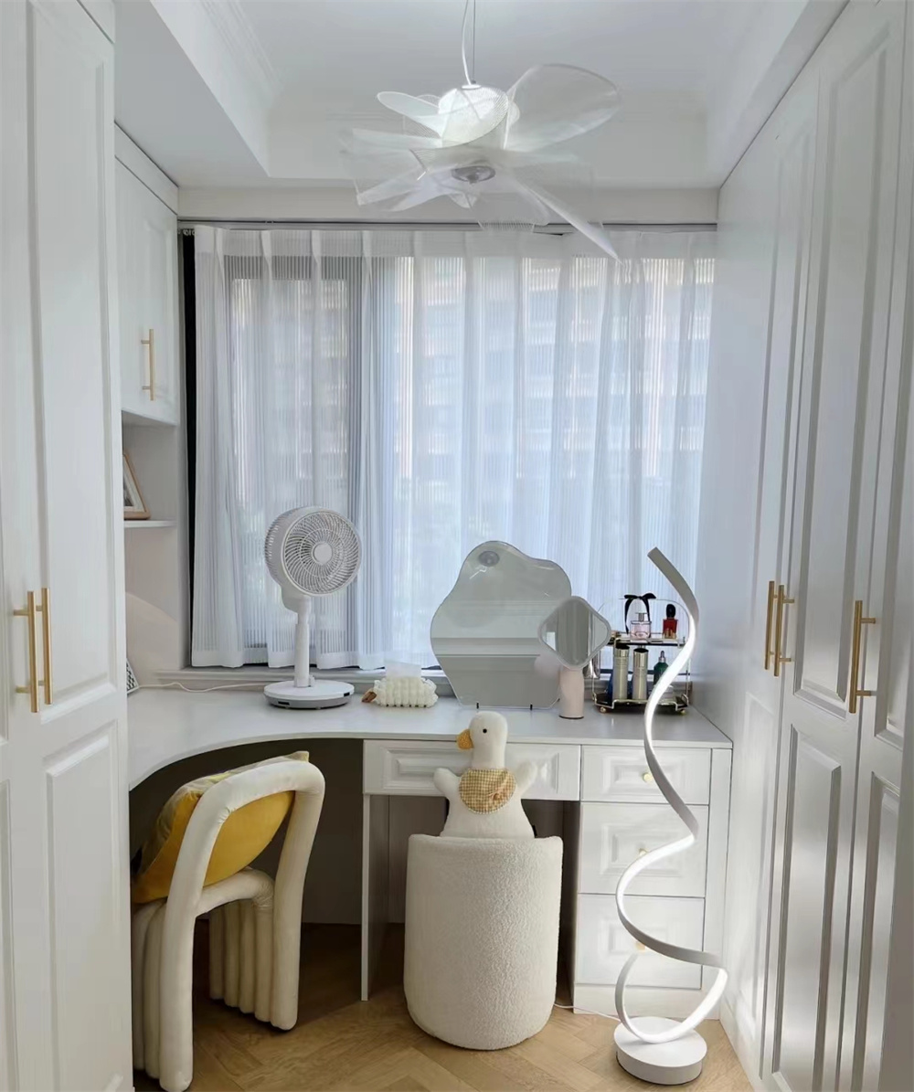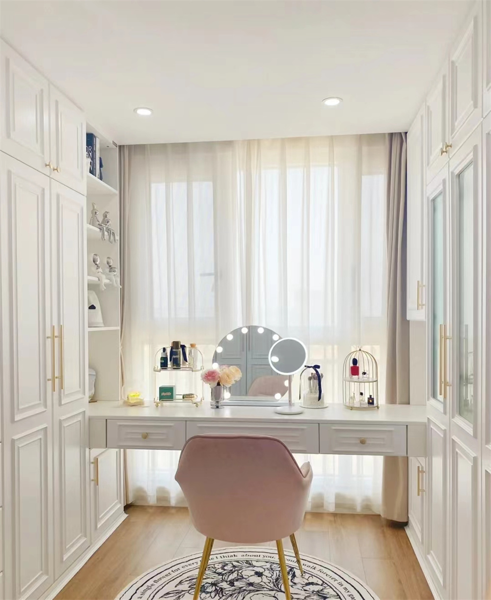 沒有多余的空間設(shè)計(jì)衣帽間,但又不想遺憾錯失,該怎么辦呢?幸福金芒果裝飾教您一個(gè)小妙招,那就是大膽嘗試不同的功能區(qū)結(jié)合,比如:書房空間、化妝空間等,可以將書房區(qū)或者化妝區(qū)置入衣帽間之內(nèi),根據(jù)使用側(cè)重點(diǎn)去設(shè)計(jì)安排功能占比,實(shí)現(xiàn)空間功能合二為一!