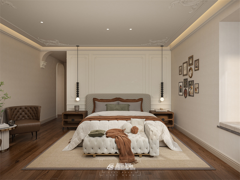 把裂痕裱進相框,回憶織成經網,復古的氛圍更顯溫馨。低飽和度的顏色,營造放松的氛圍,更有利于擁有良好的睡眠。法式的貴氣展露著低調的奢華,浪漫優雅的感覺彌漫在空間每一個角落。