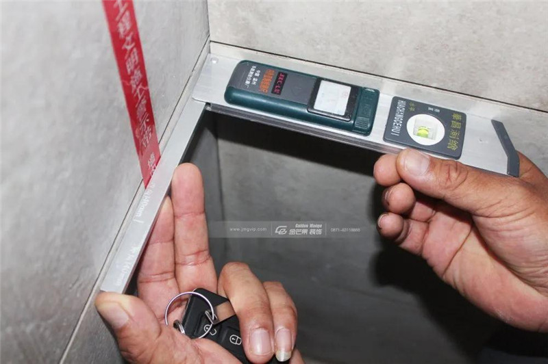 專(zhuān)業(yè)儀器角尺對(duì)墻磚的陰角進(jìn)行檢測(cè),以求達(dá)到規(guī)范的角度要求,更加方便后續(xù)的成品安裝。